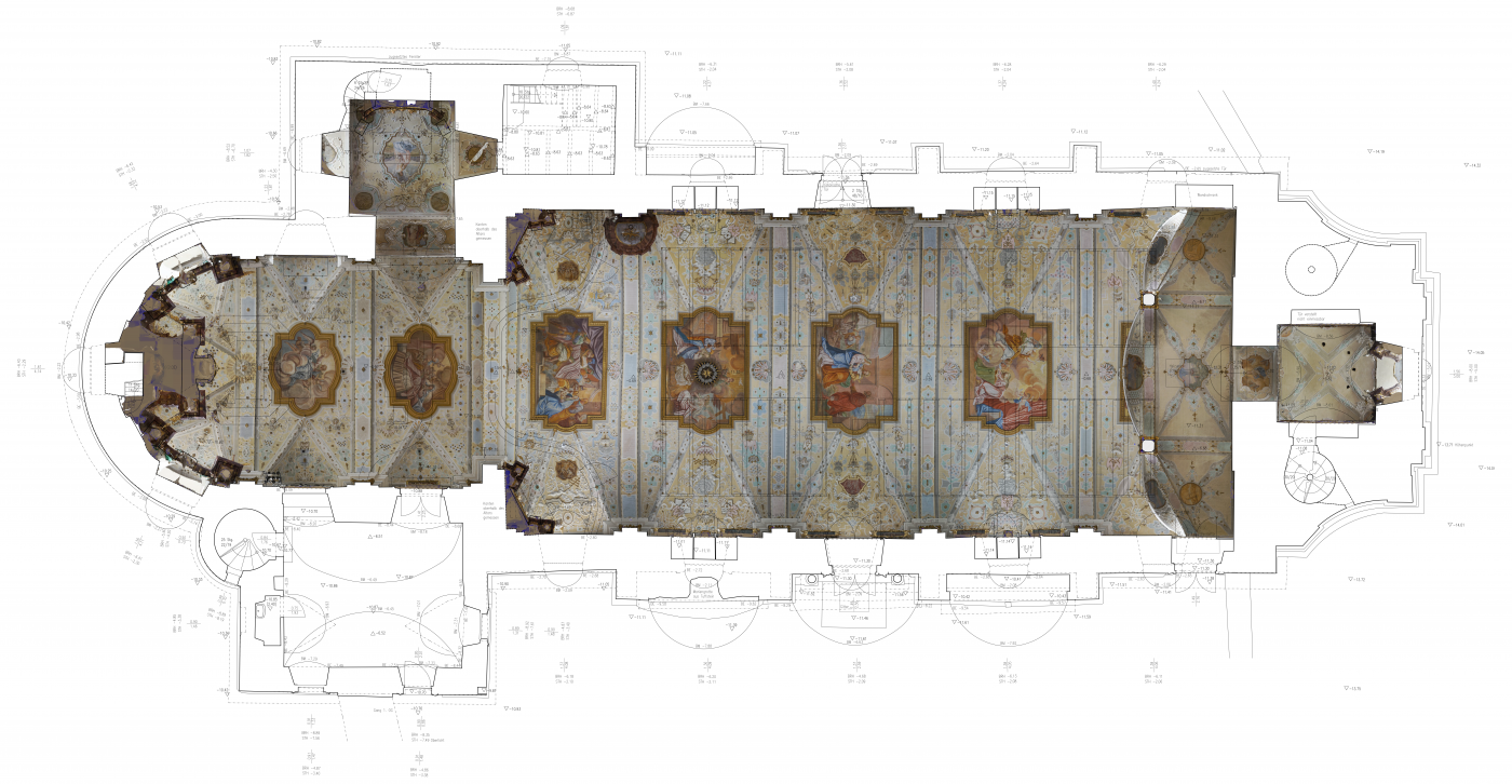 Das in 1718 / 1719 erbaute und 1720 geweihte Langhaus der Basilika sollte restauriert werden. Als Grundlage für die Restauratoren wurden neben tachymetrisch vermessenen Grundriss auch Messfotos der reich verzierten Decke und der Wände mittels SfM (Structure from Motion) erstellt. So dienen die Bilder als Mess- und Kartierungswerkzeug.